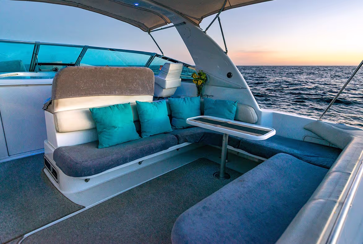 Enjoy Cabo San Lucas on a luxurious 42 ft yacht. With a large padded cabin top cushions and a shaded wided cockpit, this luxury sport cruiser will accommodate you and your style while enjoying snorkeling or sunset cruise in Cabo San Lucas.