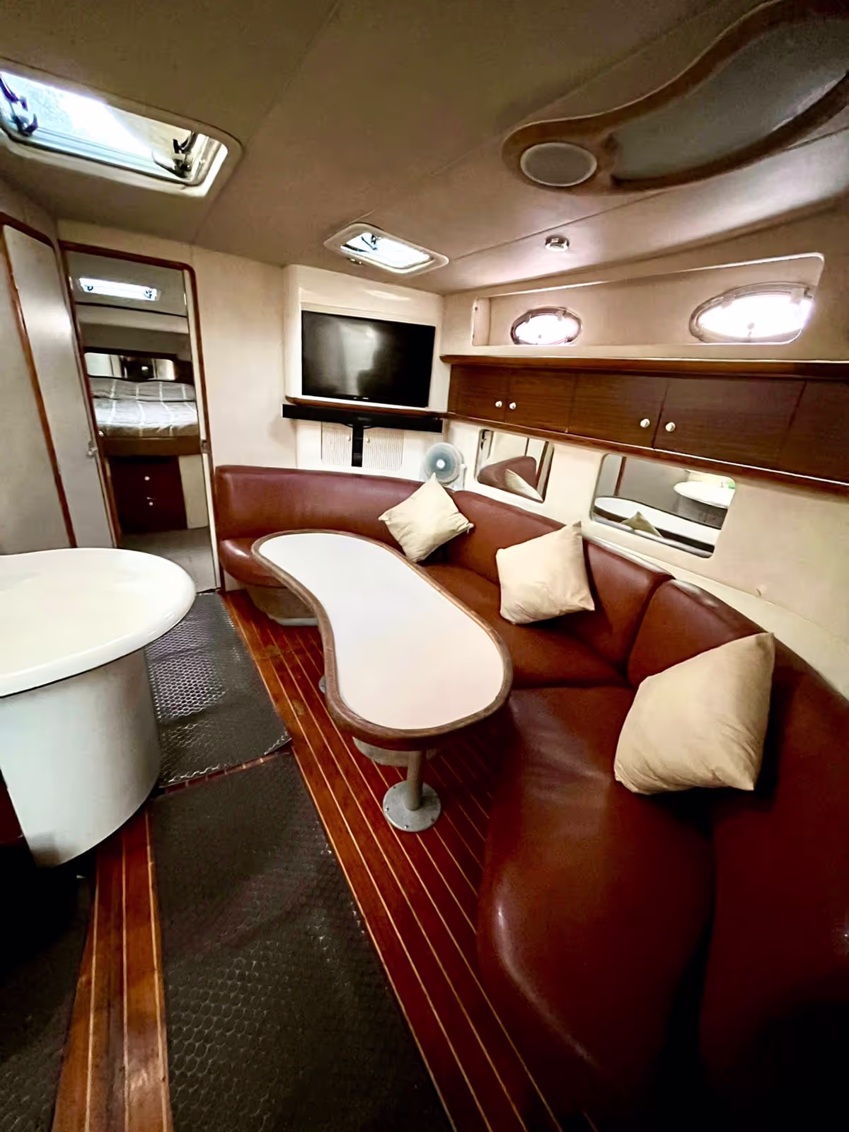 This 48' Sea Ray offers one of the largest front exterior spaces with custom-made mattresses, perfect for sunbathing, dancing, or relaxing. The aft area includes a comfortable lounge and custom table, while the interior provides a bathroom, lounge, and cabin for your group's comfort.Relax on the 48' Sea Ray with spacious sunbathing areas, a comfortable lounge, custom table, and interior cabin, perfect for your group’s comfort.