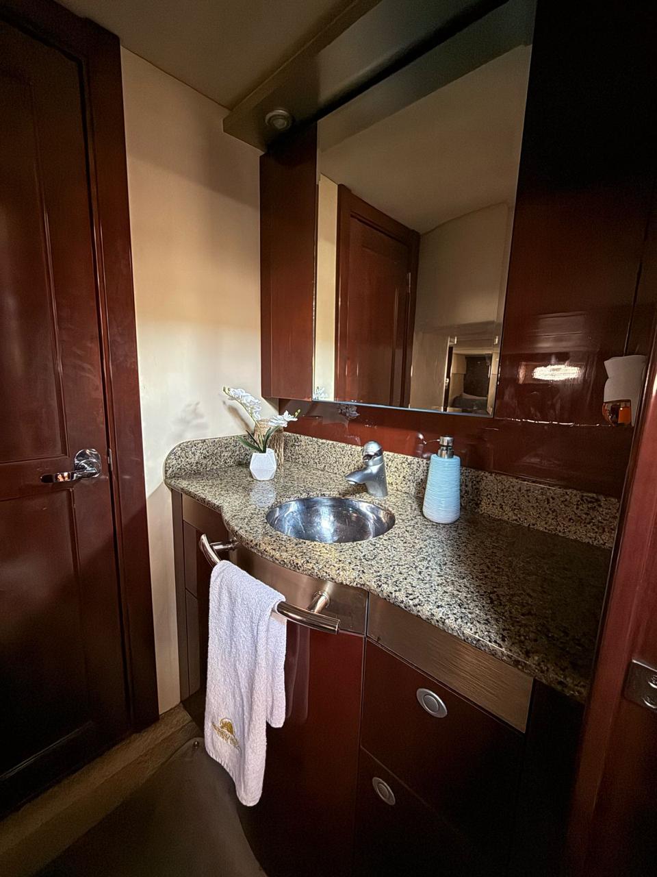A 50 ft Sea Ray with air conditioning, two cabins, two bathrooms, living room, kitchen (refrigerator, microwave), sundecks, Bluetooth music, optional BBQ.