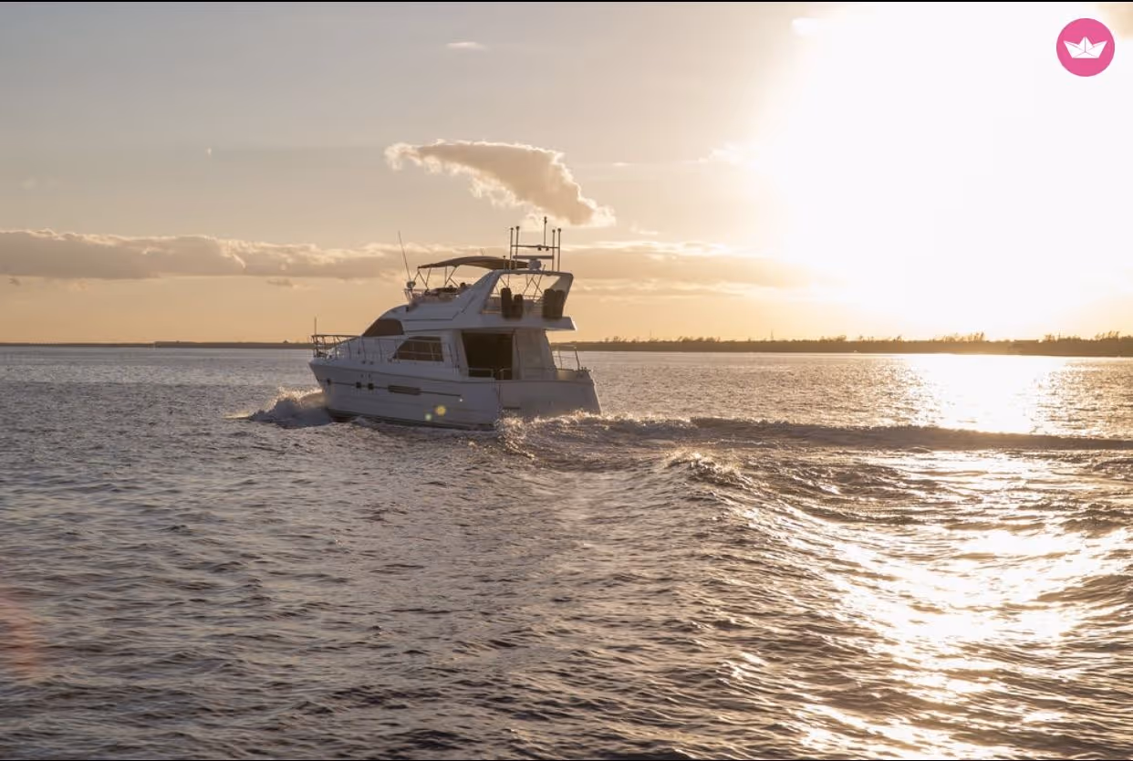 This sleek yacht offers 360-degree views from the flybridge and a spacious sun deck perfect for relaxing. Inside, enjoy the cool air-conditioned salon with comfortable U-shaped seating and a seamless galley.