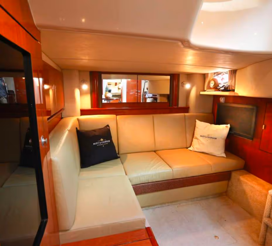 This spacious and luxurious boat offers impeccable comfort, ample shade, and a cozy setting for friends and family to relax and savor the picturesque sights, making it an unforgettable choice for exploring the waters. Whether you seek to bask in the sun or partake in exhilarating activities such as snorkeling and cruising, this boat has everything you need. Includes 2 interior seating areas with AC.