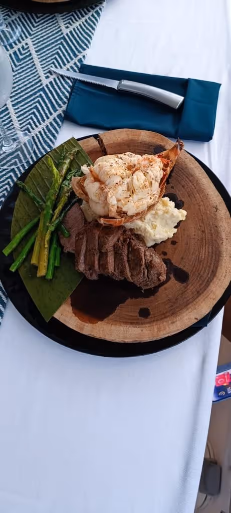 Cheese Plate, Tropical Style Salad, Surf & Turf (Lobster & Filet Mignon, Dessert: Chef’s Choice