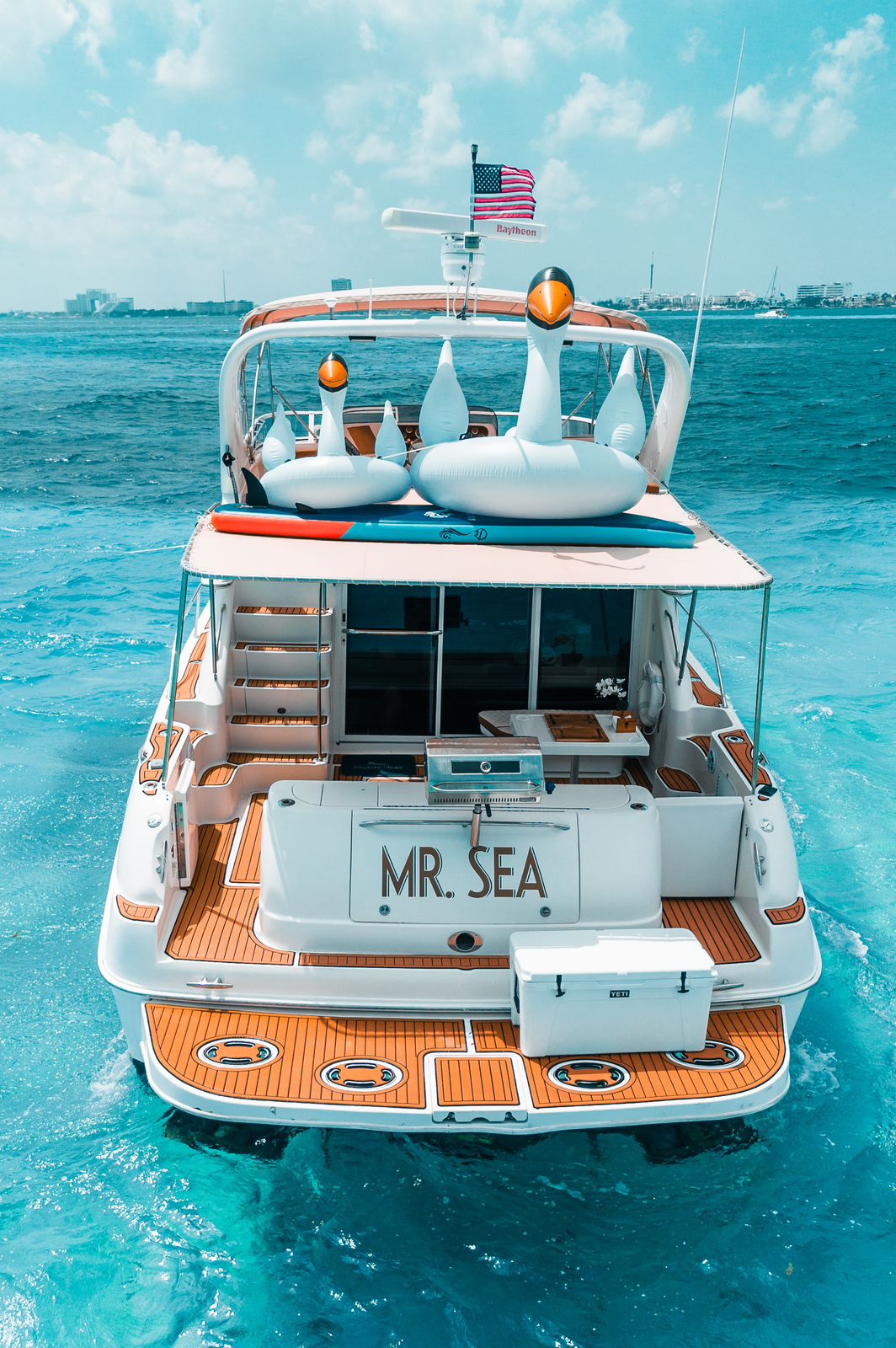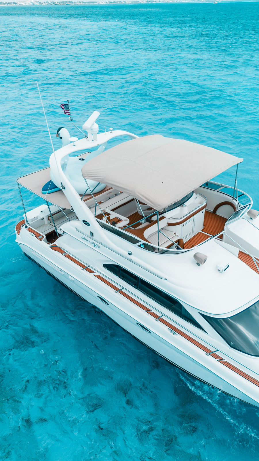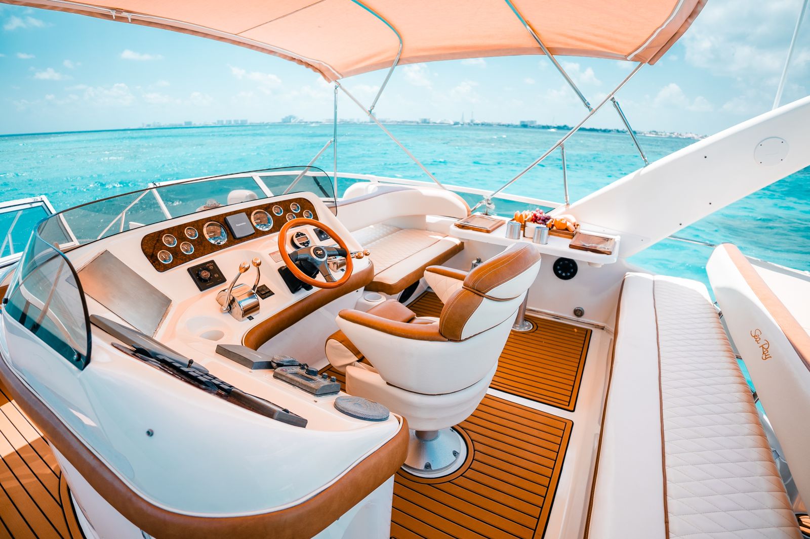 Charter the 47ft Sea Ray TRUCO IV — 2 cabins, A/C lounge, JL Bluetooth sound, bow sundeck & hydraulic platform. Book your Cancún yacht experience today!